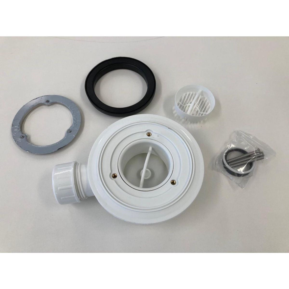 Plat douchebaksifon Domo wit inbouwhoogte 55mm met uitneembaar zeefje. Met 40mm zij- aansluiting, geschikt voor een afvoergat diameter 90mm. Basismodel zonder afdekplaat (ook geschikt voor composiet en Solid Surface doucheplaten).