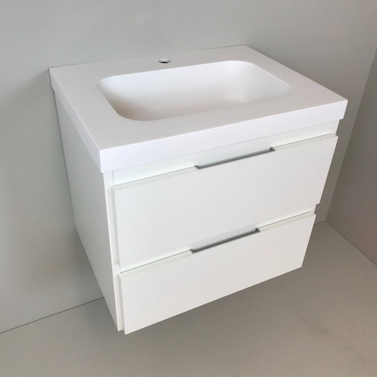 Fraai badmeubel van MDF wit gelakt met 2 Softclose lades waarvan de bovenste lade is voorzien van een uitsparing voor een sifon. Afmetingen 60x45x55cm (bxdxh), inclusief composiet wastafel dikte 5cm met geïntegreerde waskom en kraangat.