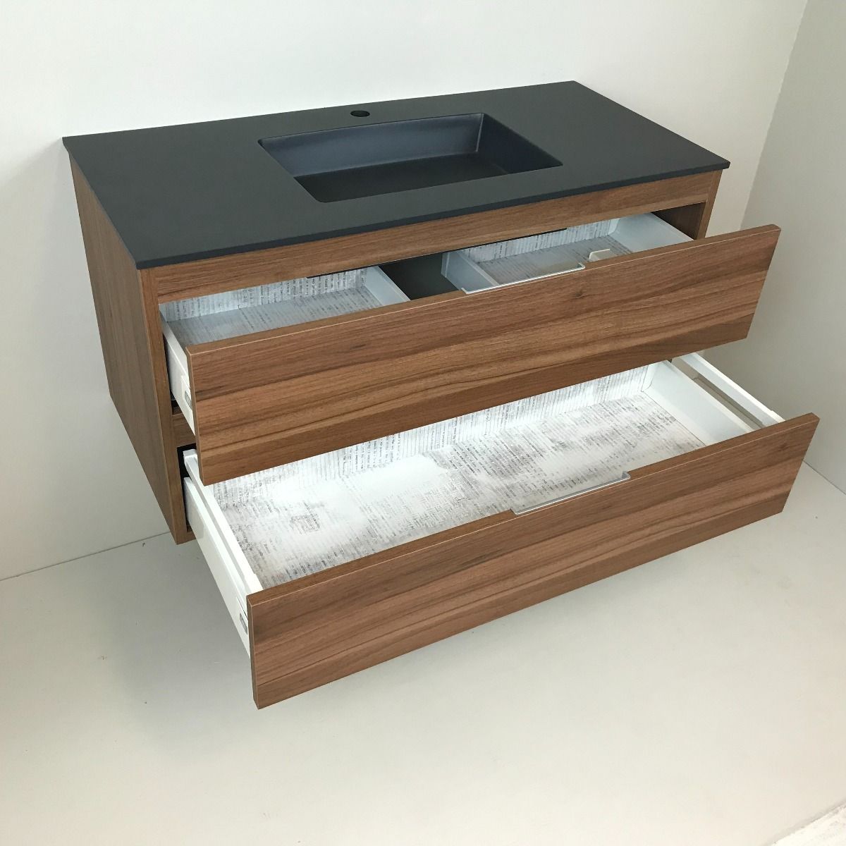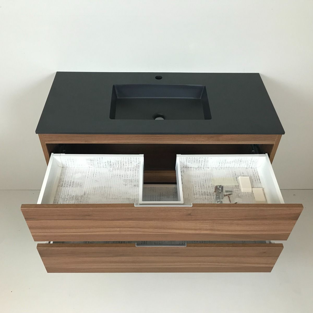 Fraai badmeubel van MDF noten 'look' met 2 Softclose lades waarvan de bovenste lade is voorzien van een uitsparing voor een sifon. Afmetingen 100x45x52cm (bxdxh), inclusief composiet wastafel dikte 1,6cm met geïntegreerde waskom en kraangat.