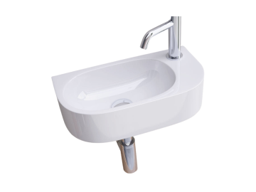 Keramisch fontein Petit 40x22cm wit glans, hoogte 11cm. Voorzien van kraangat en standaard afvoergat diameter 46mm. Zowel hangend aan de muur als als opzet waskom te monteren, ideaal voor de kleinere toiletruimte's.